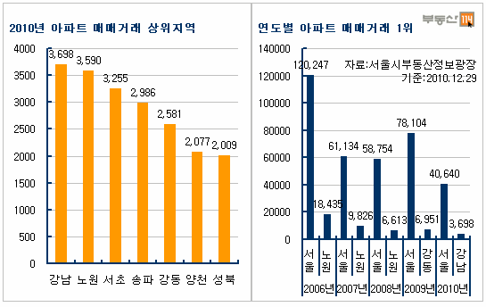 서울시부동산정보광장에 따르면 2010년 아파트 매매거래 중 강남에서 총 3698건이 이뤄져 서울시 내에서 가장 거래 건수가 많았다.