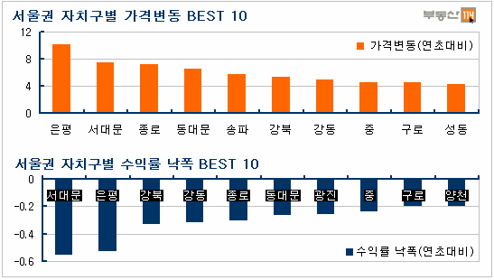 ▽서대문(-0.55%p) ▽은평(-0.52%p) ▽강북(-0.32%p) ▽강동(-0.31%p) ▽종로(-0.30p) ▽동대문(-0.26%p) ▽광진(-0.25%p) ▽중(-0.23%p) ▽구로/양천(-0.19%p) 순이었다.