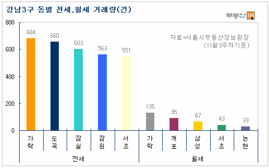 강남3구 중 11월까지 전세거래가 가장 많았던 송파 가락동은 가락시영재건축아파트와 같이 오래되거나 상대적으로 저렴한 전세아파트 위주로 거래사례가 많았다. 뒤를 이은 강남 도곡동은 전세가격이 비싼지역이지만 신규 아파트가 많아 선호도가 높다. 송파 잠실동은 잠실주공5단지와 같이 오래된 아파트뿐만 아니라 새아파트도 많아 전세거래가 많이 이뤄졌다.
